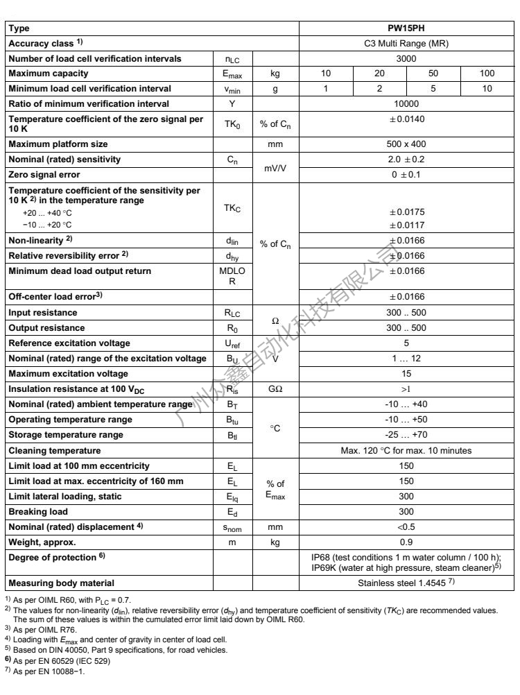 五、PW15PHC3稱重傳感器技術(shù)參數(shù)