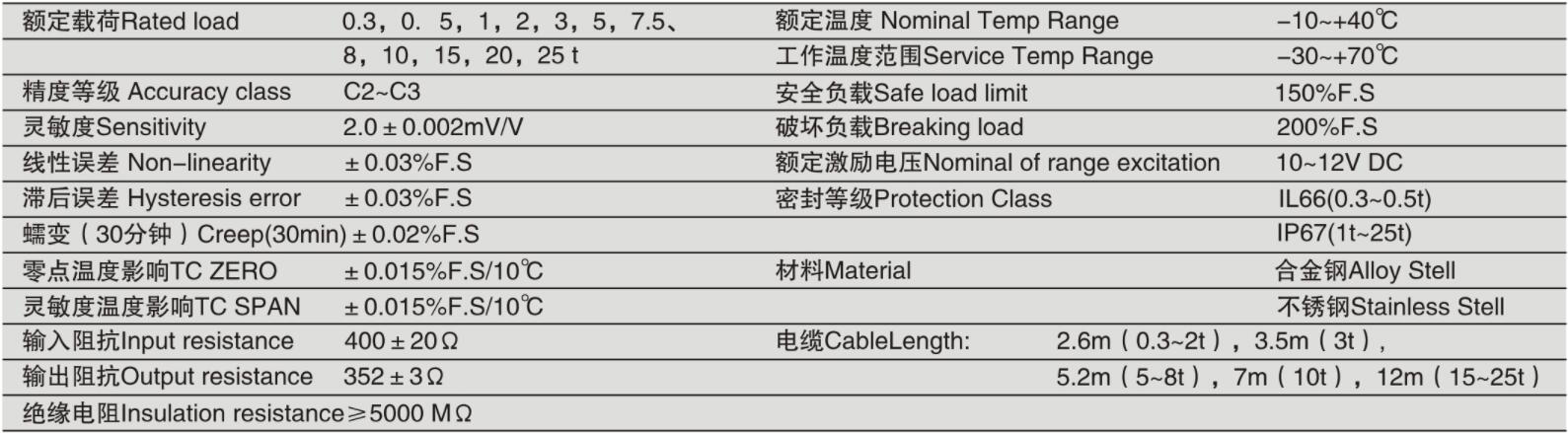 柯力BTB-A系列稱重傳感器技術(shù)參數(shù)