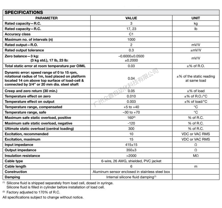 五、美國(guó)特迪亞 1430-23lbs稱(chēng)重傳感器技術(shù)參數(shù)
