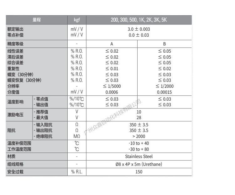 五、韓國凱士CAS品牌 CTS-5T-EXP稱重傳感器技術參數(shù)
