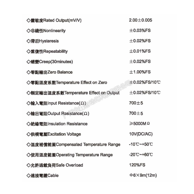 四、CP-4-20T稱重傳感器技術(shù)參數(shù)