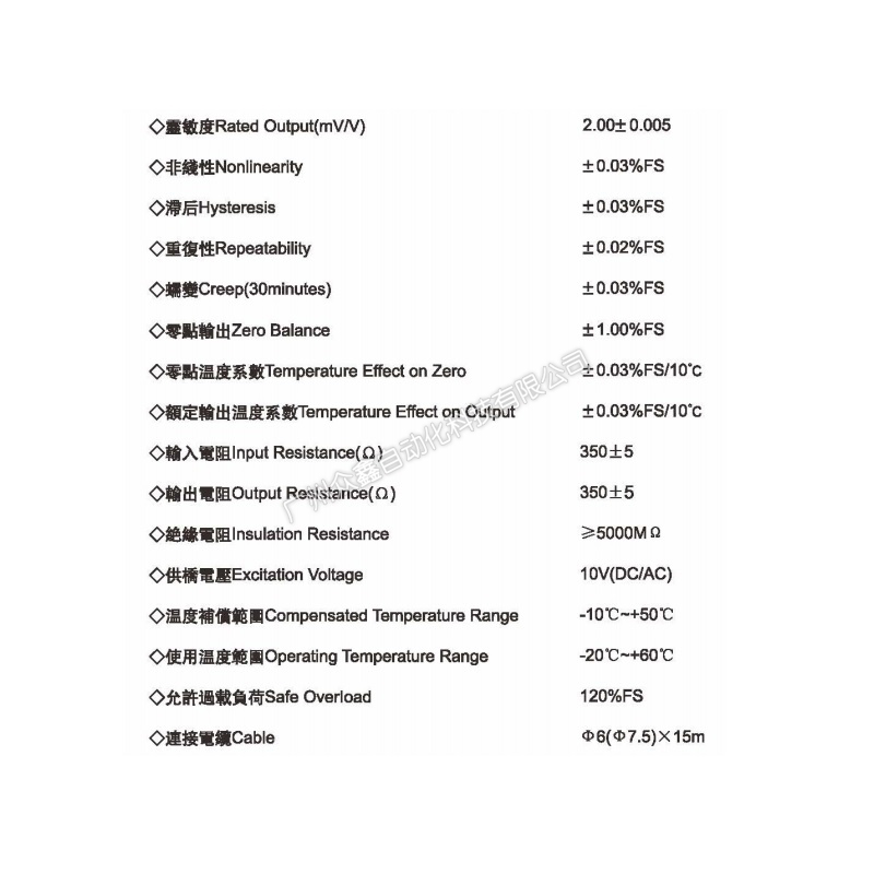 四、CP-9-10T稱重傳感器技術(shù)參數(shù)