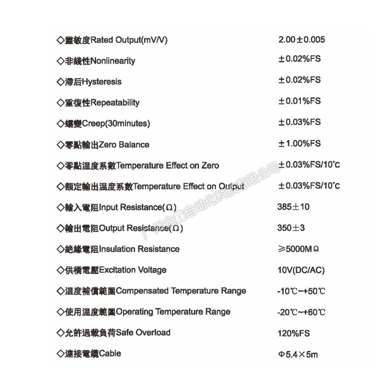 四、PE-8-20kg稱重傳感器技術(shù)參數(shù)