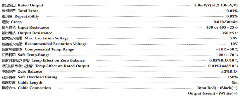 臺灣JIHSENSE S LOAD CELL規(guī)格參數(shù)