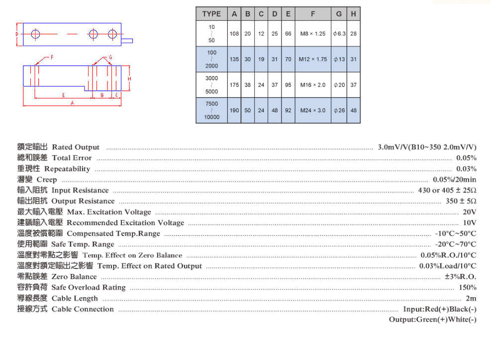 B型荷重元( B Load cell)系常用的地磅荷重元,其高敏感度剪刀感應(yīng)結(jié)構(gòu)及完全密封式保護(hù),使荷重感應(yīng)達(dá)到最高 之精度與敏感度,特別適用於地磅、吊秤、重量、力量量測(cè)及自動(dòng)控制上,具以下之特點(diǎn):密封保護(hù),安裝容易,溫度變化補(bǔ)償,高精度,拉壓兩用。
