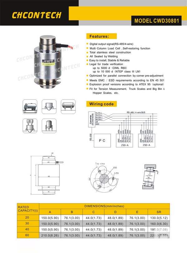 【廣州眾鑫自動化科技有限公司】專業(yè)供應(yīng)美國chcontech CWD30801系列稱重傳感器,【CWD30801柱式傳感器】CWD30801-20t~100t_美國chcontech稱重傳感器保證貨期快捷,100%原裝進口,為多種工業(yè)領(lǐng)域提高完整的自動化稱重解決方案。美國chcontech CWD30801系列稱重傳感器相關(guān)型號:CWD30801-20t,CWD30801-30t,CWD30801-40t,CWD30801-60t.
