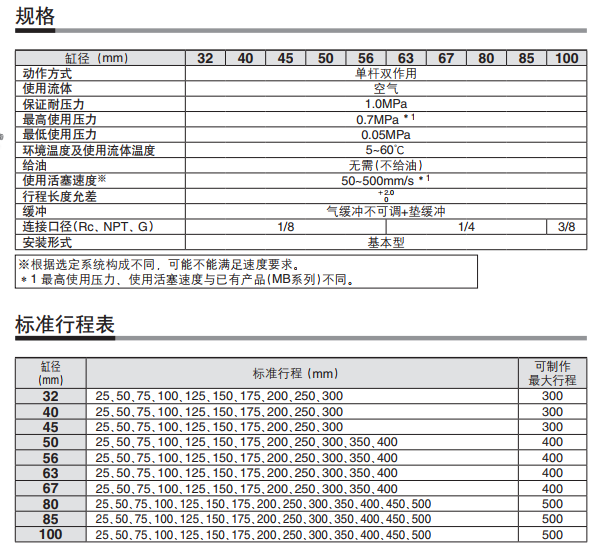 JMB系列氣缸規(guī)格和行程表