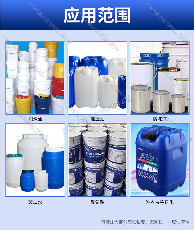 泵送料到灌裝機的進口管道,變頻器控制泵的流速,先快后慢,稱重式灌裝,灌裝完畢,灌裝嘴不滴漏。機器主體采用不銹鋼材質。灌裝容量10-25L。此型號機器可灌注大部分高低粘度,無顆粒、非爆性液體,廣泛應用于潤滑油,液壓油,防凍液,玻璃水,聚氨酯,化妝品日化等行業(yè)。