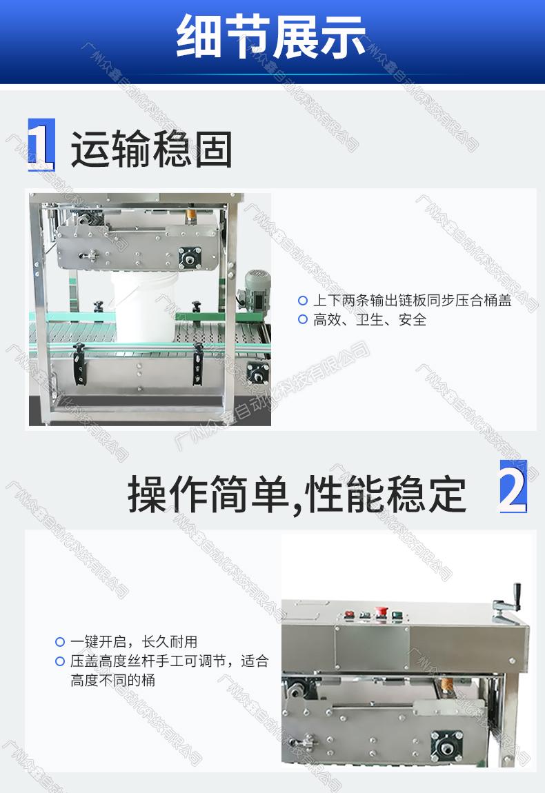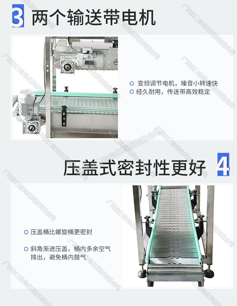 上下兩條輸送鏈板同步壓合桶蓋,斜角漸進(jìn)壓蓋,桶內(nèi)多余空氣排出,避免桶內(nèi)鼓氣。自動(dòng)化生產(chǎn),無(wú)需人為操作,降低用人成本,提高生產(chǎn)效率。