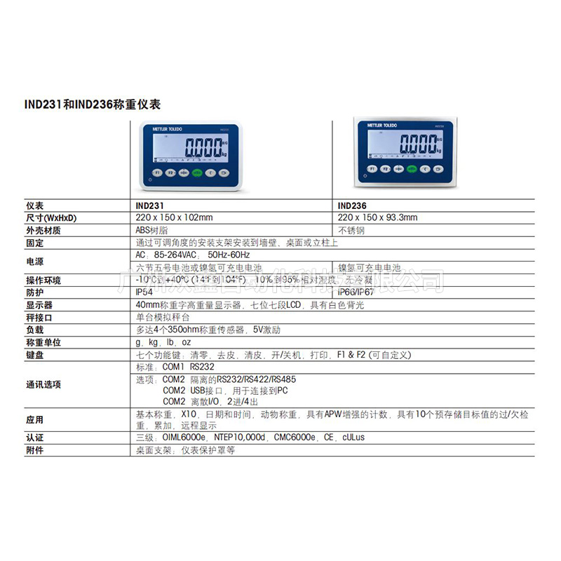六、梅特勒托利多 IND236稱重儀表技術(shù)指標