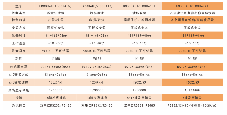 GM8804C系列產(chǎn)品是專(zhuān)門(mén)為減量法包裝秤,非連續(xù)累計(jì)秤和液體灌裝秤而開(kāi)發(fā)的一類(lèi)稱(chēng)重控制儀表。廣泛應(yīng)用于飼料、化工、糧食、建材等行業(yè)。GM8804C-8稱(chēng)重控制器是一款多功能預(yù)置點(diǎn)輸出稱(chēng)重顯示器,它擁有多個(gè)預(yù)置點(diǎn)輸出,是顯示精度可達(dá)到十萬(wàn)分之一的高精度儀表。