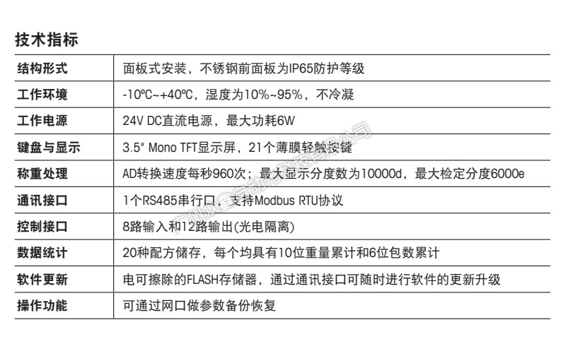 五、梅特勒托利多 C30稱重顯示控制器技術(shù)指標(biāo)