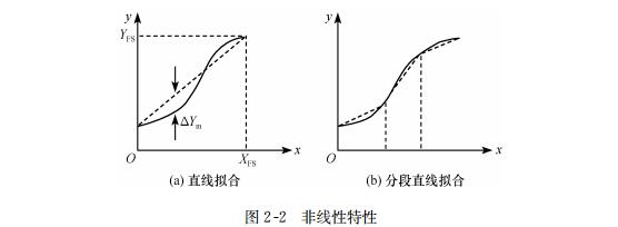 由于非線性是以某種擬合直線為基準(zhǔn)線而定的,故不同的擬合所得的線性度不同。常用的擬合方法有基準(zhǔn)線性擬合、獨(dú)立線性擬合、最小二乘法擬合等。很明顯,這種擬合將產(chǎn)生線性化誤差。圖2-2(b)所示的分段折線逼近曲線將有較高的擬合精度,分段越多,擬合精度越高。例如,傳感器后接微機(jī)系統(tǒng),線性補(bǔ)償將是非常容易的,可有效地提高傳感器的測(cè)量精度。