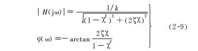 由圖可見,頻率特性與兩個(gè)參數(shù)有關(guān),即無阻尼的固有頻率 ω0(在 χ = 1 處)和比阻尼系數(shù)ζ,同時(shí)可以看出諧振峰值大小和諧振頻率 ω n 隨 ζ 而變化 ,對式(2-9) 進(jìn)行微分,并使之等于零,可得